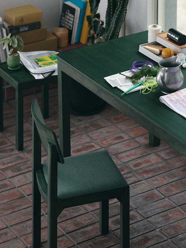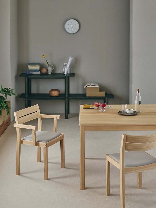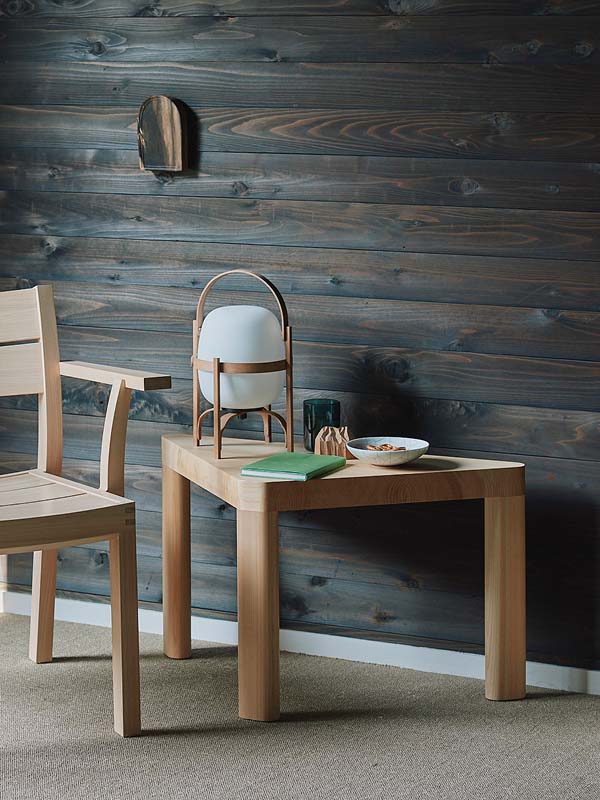 こうした考察をもとに、ある程度のボリュームをもってヒノキの確かな存在感を示しながら、空間を遮ることなく、暮らしに役立ち、シーンを彩ることができるものとは。さまざまにスタディを重ねたうえでコッコネンが辿り着いたのが、この〈VK Side table 01〉でした。部屋の角にぴったり収まるかたちは、インテリアをすっきりとまとめたいときや、印象的なコーナーをつくりたいときにオススメ。また、椅子、ソファと組み合わせたり、ベッドサイドテーブルとしても使うことを考え、高さを440mm に設定しました。