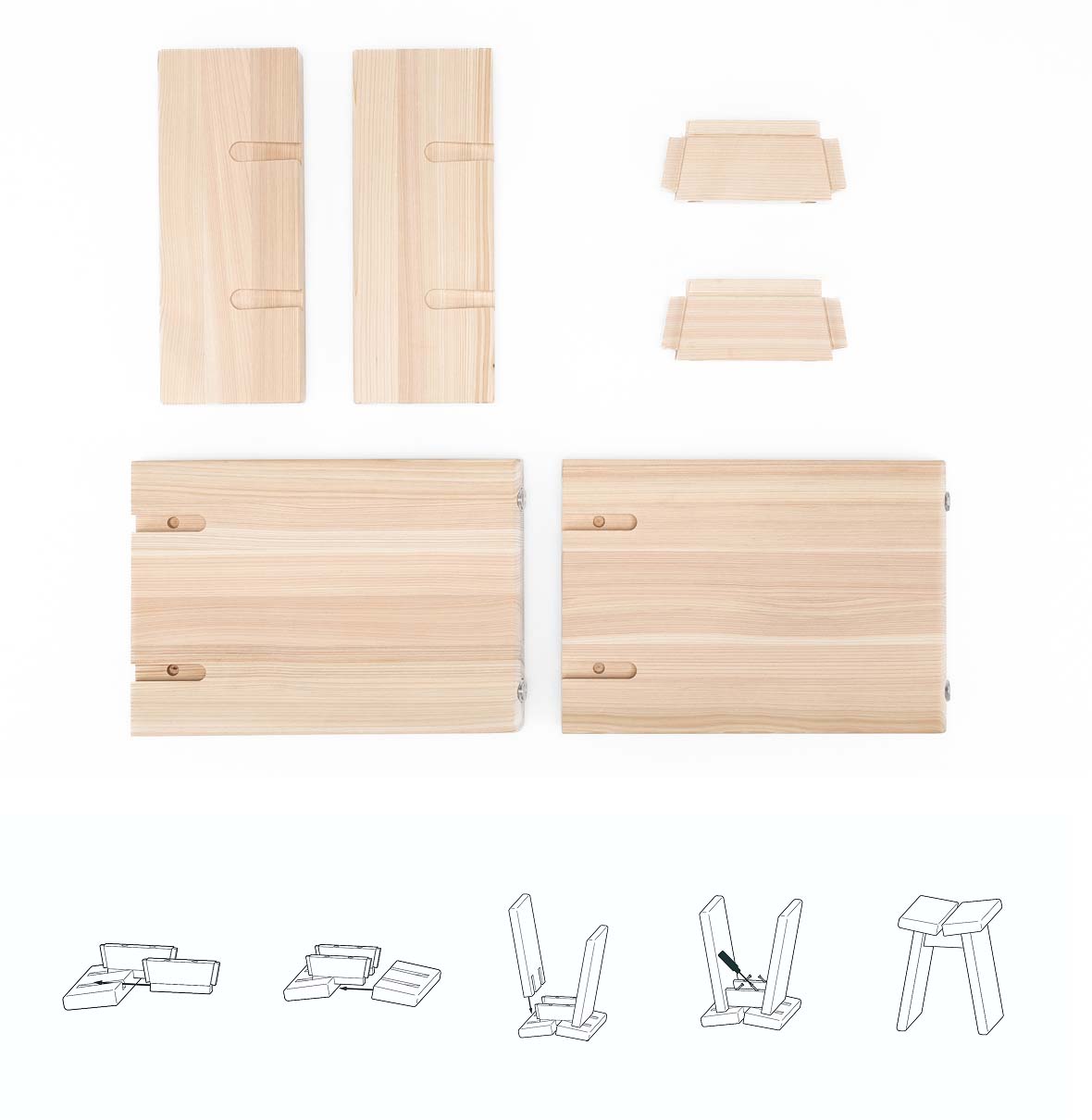 また、組み立て式のフラットパックを採用したことで、ヒノキの肌触りを感じながら、自身で家具をつくる楽しみを加味しているのも特徴です。軽量でボックス入りになっているので、引っ越しや新築の祝い、結婚、出産の贈答品としてもオススメです。デザイン性が高く、コンパクトなので、靴を履く時の小椅子として玄関先に置くほか、ベッドやソファの脇に添えてサイドテーブルとして使うこともできます。