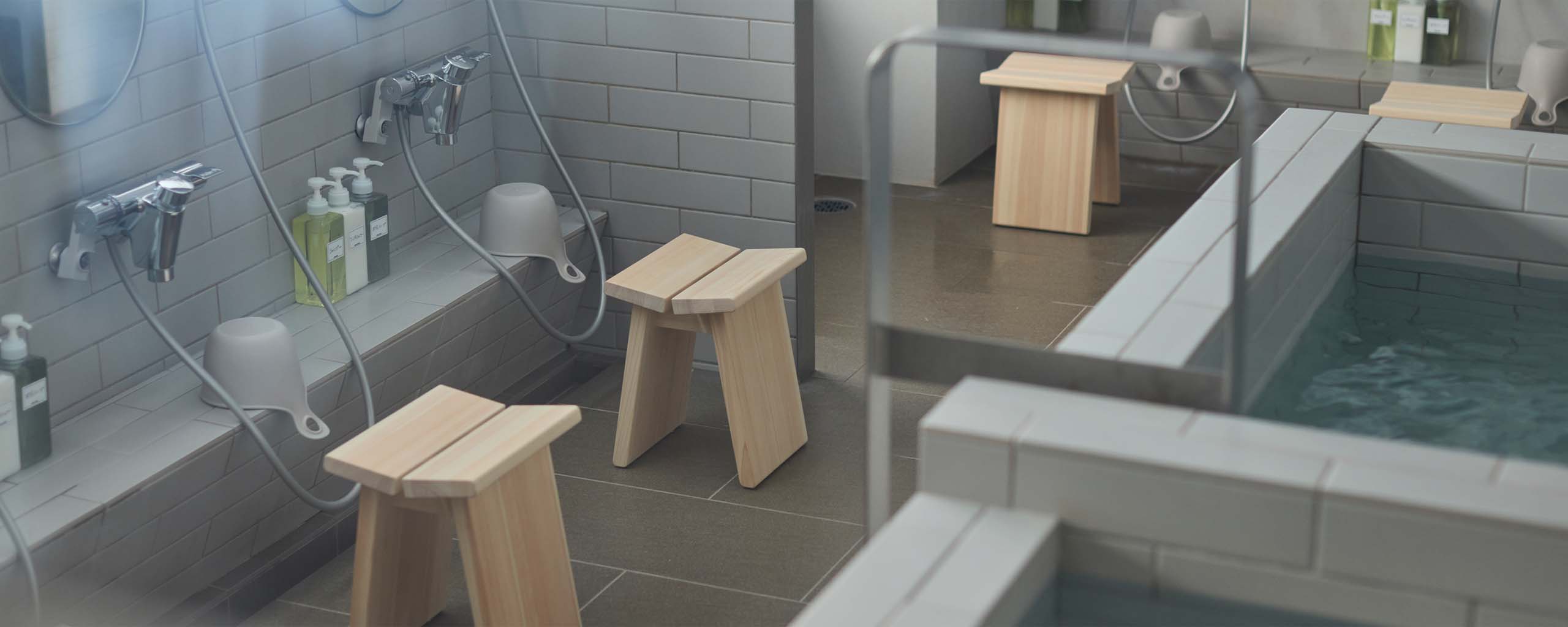 浴槽にたっぷりと湯を張って浸かり、洗い場に出ては体を清める。ほかの国では見られない特殊な入浴スタイルを誇る日本には、入浴のための独自の道具も揃います。その典型の一つが風呂椅子でしょう。さらに、ヒノキは、肌触りが良く、抗菌性、耐朽性が高い上に、アルファビンやトルネオールなどのリラックス効果を持つ香り成分を持つことから、浴槽や湯道具として古くから愛用されてきた素材です。