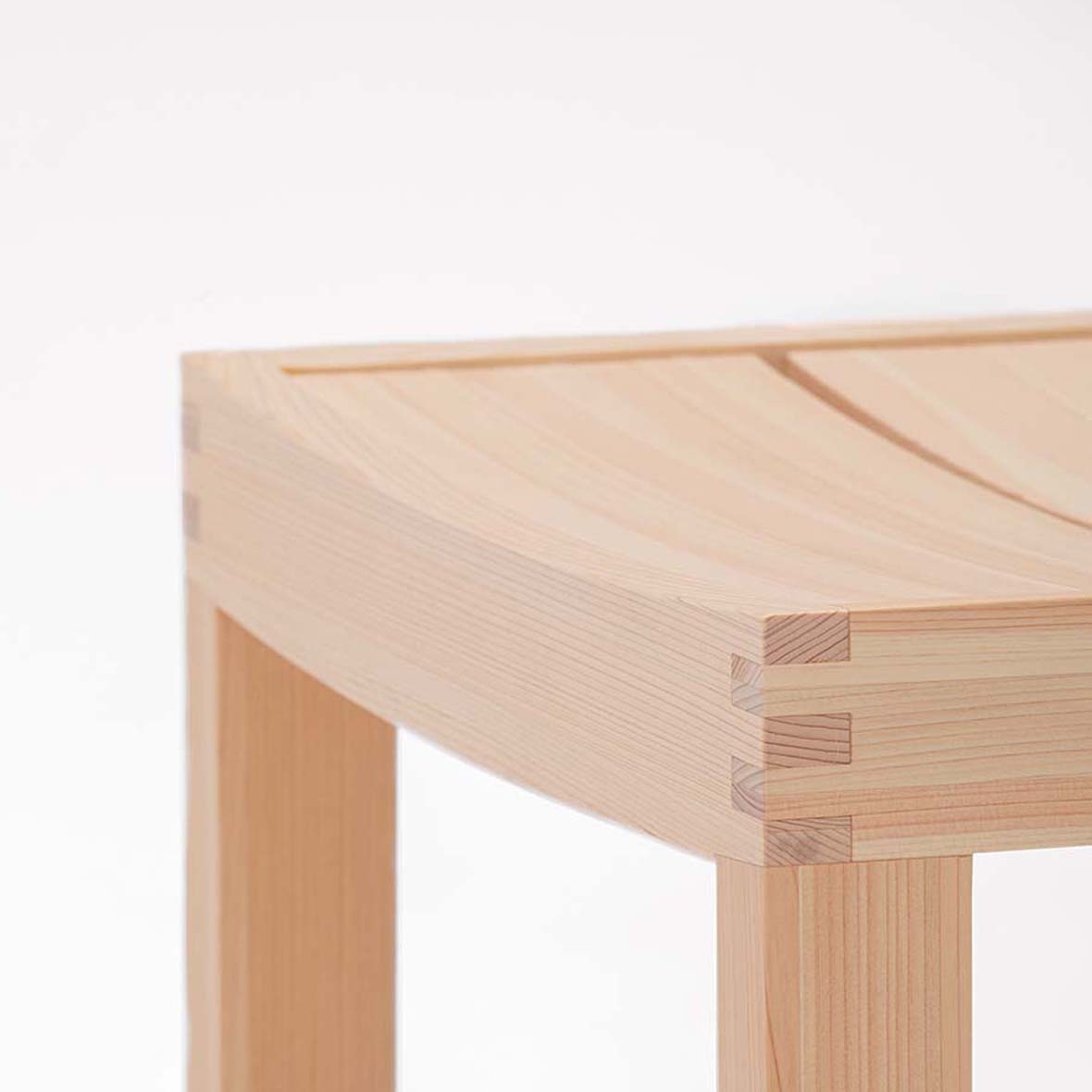 針葉樹の木目を際立たせるためには、ほっそりとしたラインではなく、ある程度たっぷりとした素材ボリューム感が必要。それでいてずんぐりむっくりの寸胴なかたちには見えず、現代の生活空間に合う存在感を示すものとはなにか? 熊野は木肌の魅力と造形とのバランスを整えながらデザインを展開しています。