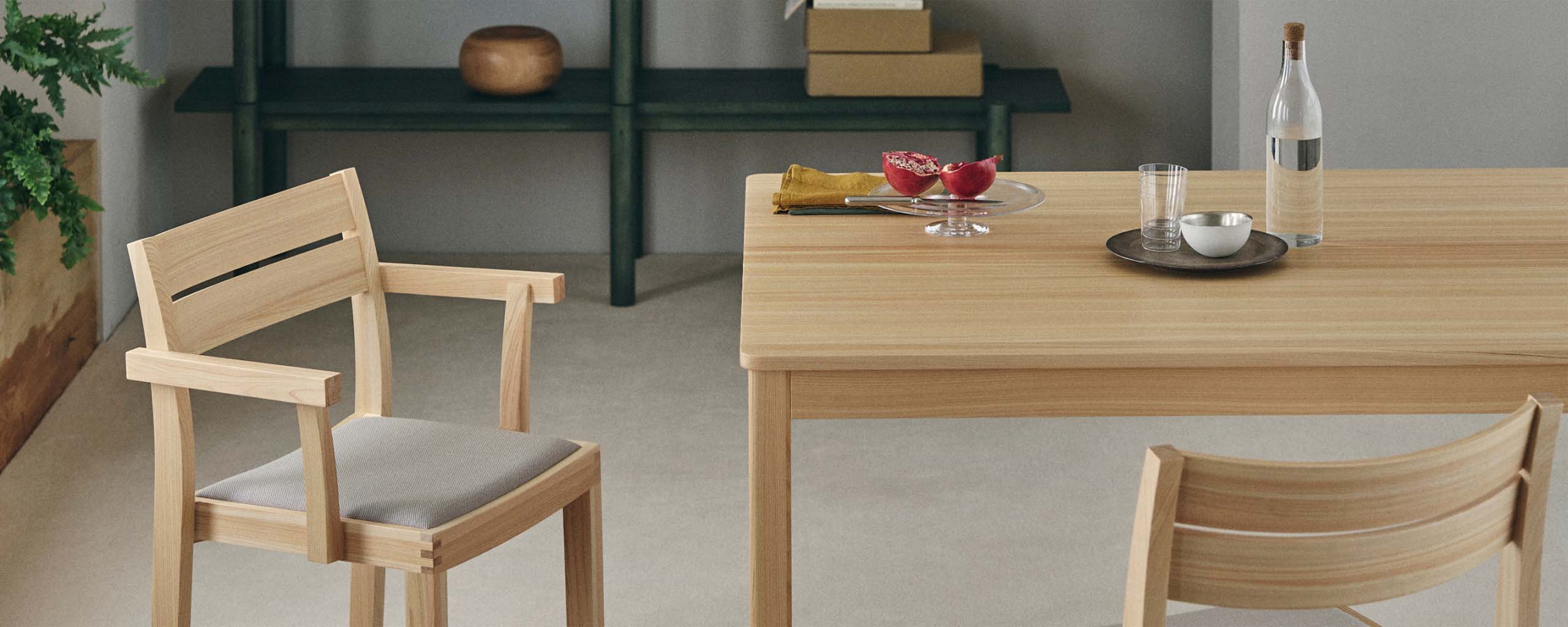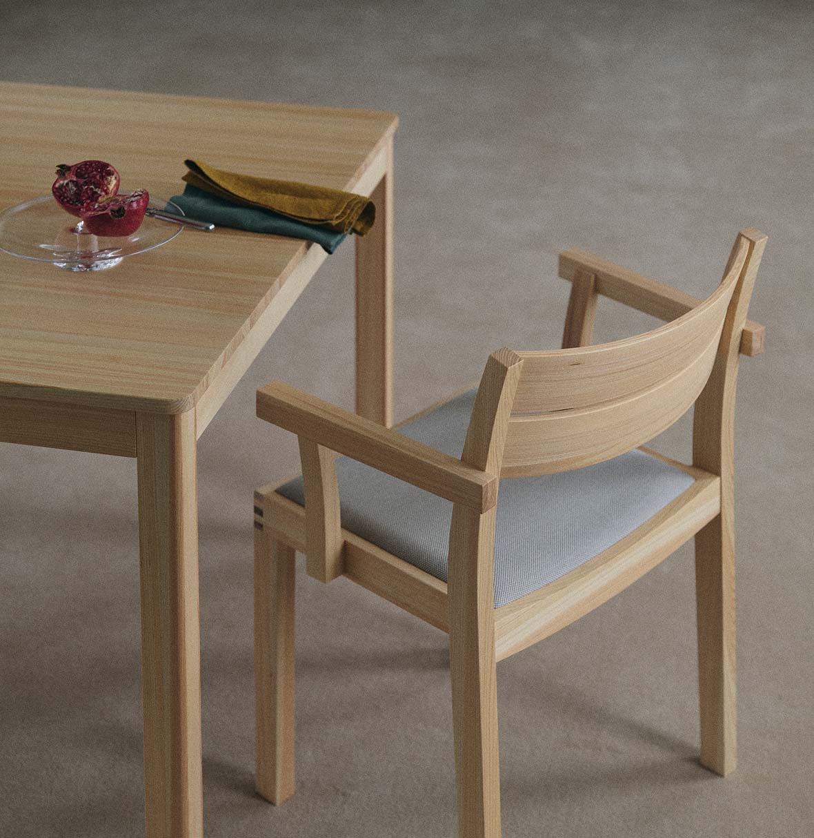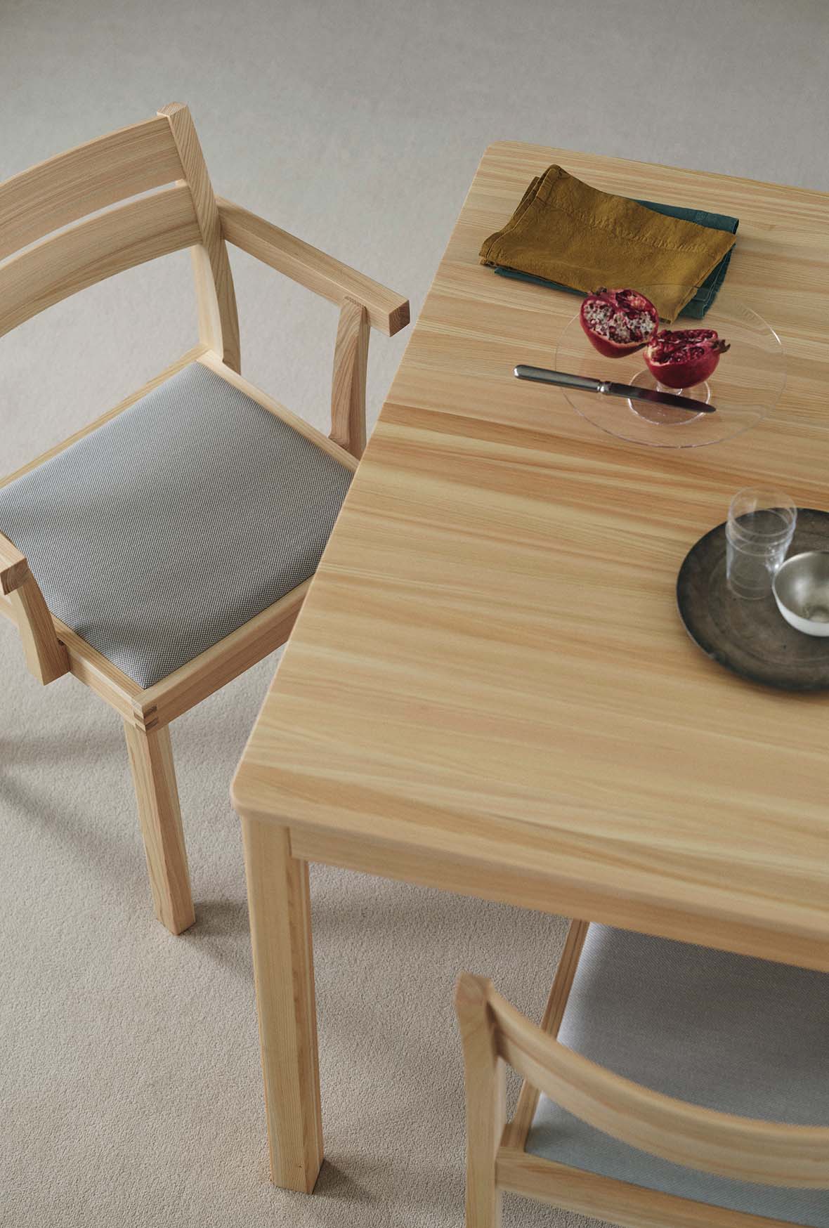 一方で、背もたれや座面は、座った瞬間にすっと人を受け入れ、長時間座っていても疲れにくいように、ゆったりとした適度なカーブを描いています。オフィスやホテル、商業空間だけでなく、住宅のリビングやダイニングでも幅広くお使いただけるように、スタンダードな板座のほかに、6 種類のファブリックを採用した張座仕様もコレクションに新しく加わり、さらに座り心地が良くなりました。張座仕様では、針葉樹の木目の美しさを上面からも感じられるように、座面フレームの四方に枠を残しているのも特徴です。