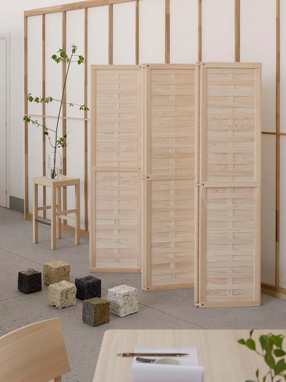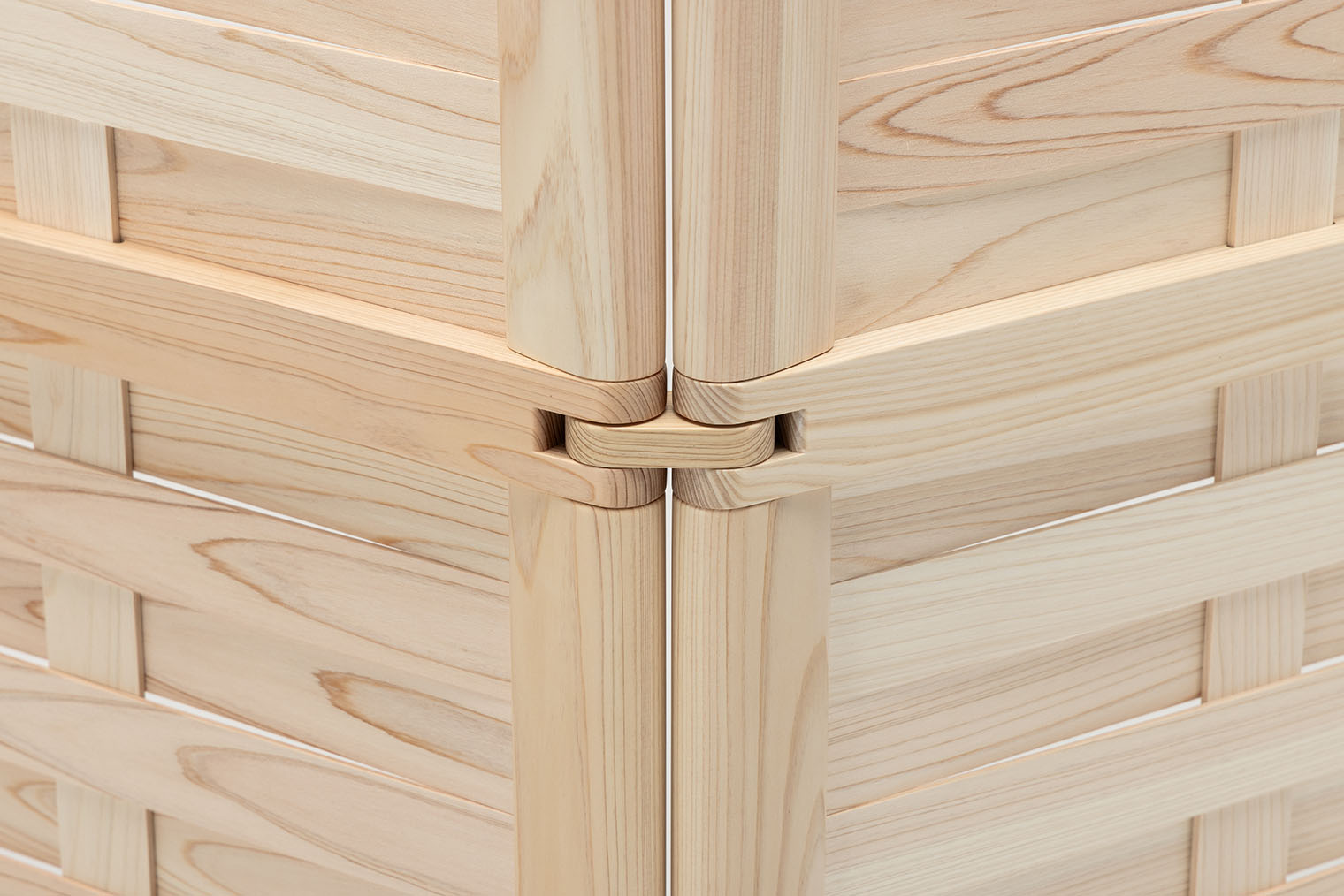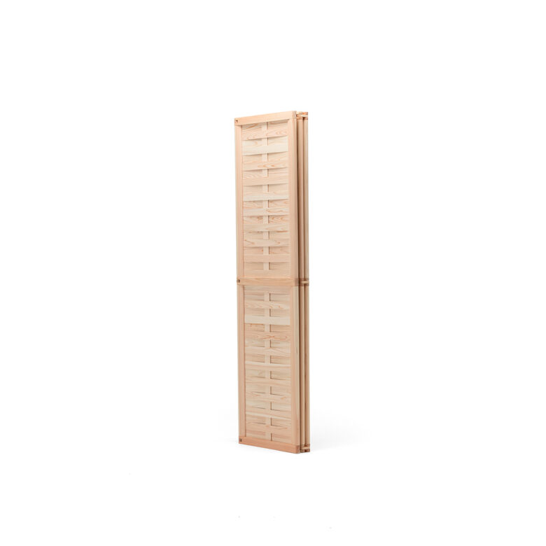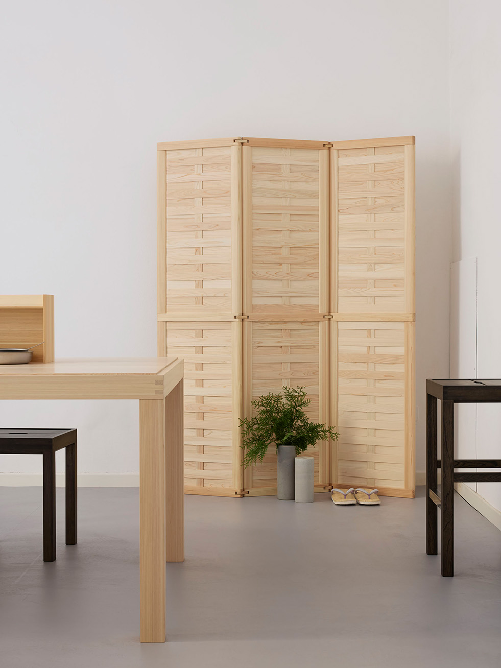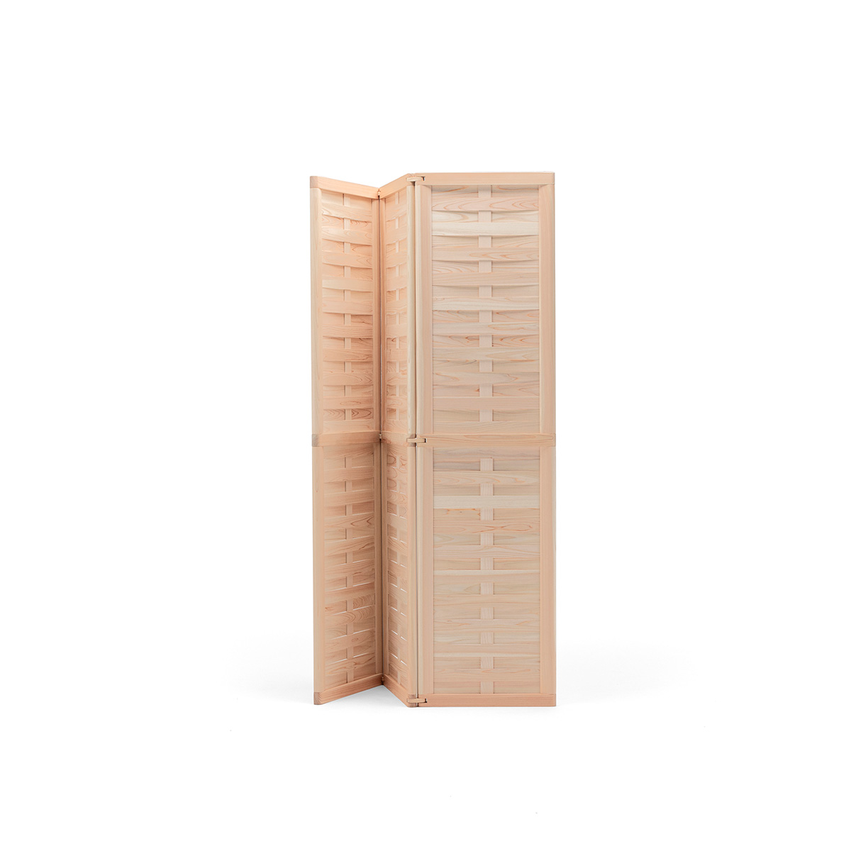 ヴィッレ・コッコネンによってデザインされた、折り畳み式の間仕切りです。研究者の側面をもつ彼らしい徹底したリサーチに基づくサスティナブルなアプローチによって、ヒノキの素材感を引き立てるモダンなパーティションが生まれました。パネル面には、工芸品などに見られる網代編み(あしろあみ)の技術が用いられ、美しい陰影を纏った豊かな表情を創り出しています。フレームはオリジナルの木製ヒンジで連結され、角度や開き具合を自由に調整することが可能。利用しない時はコンパクトに折り畳み、収納することもできます。サイズバリエーションは2種類。設置する場所や用途に応じ、多彩なアレンジをお楽しみいただけます。