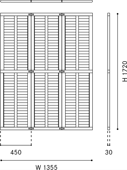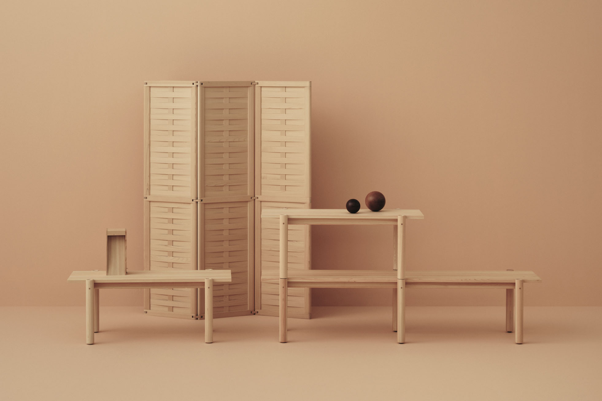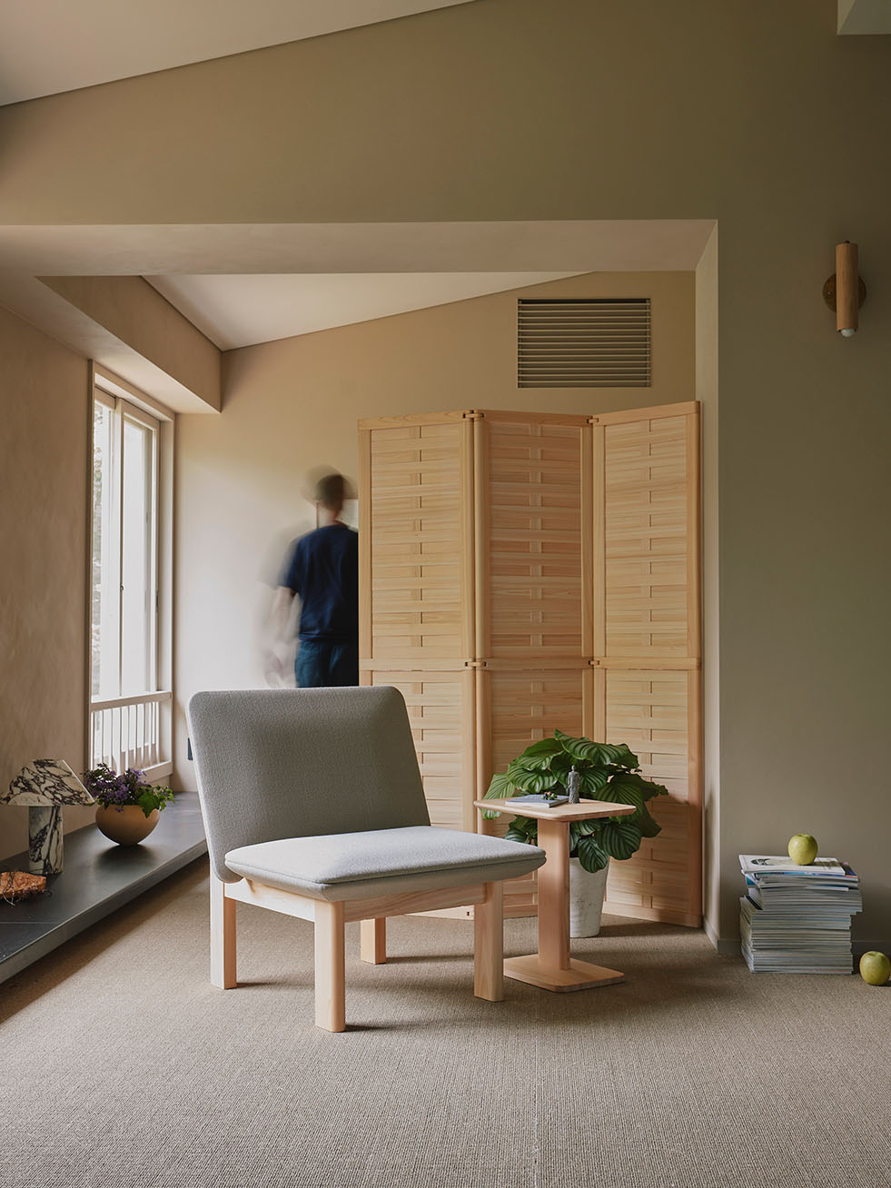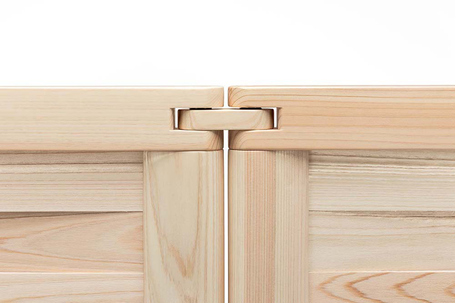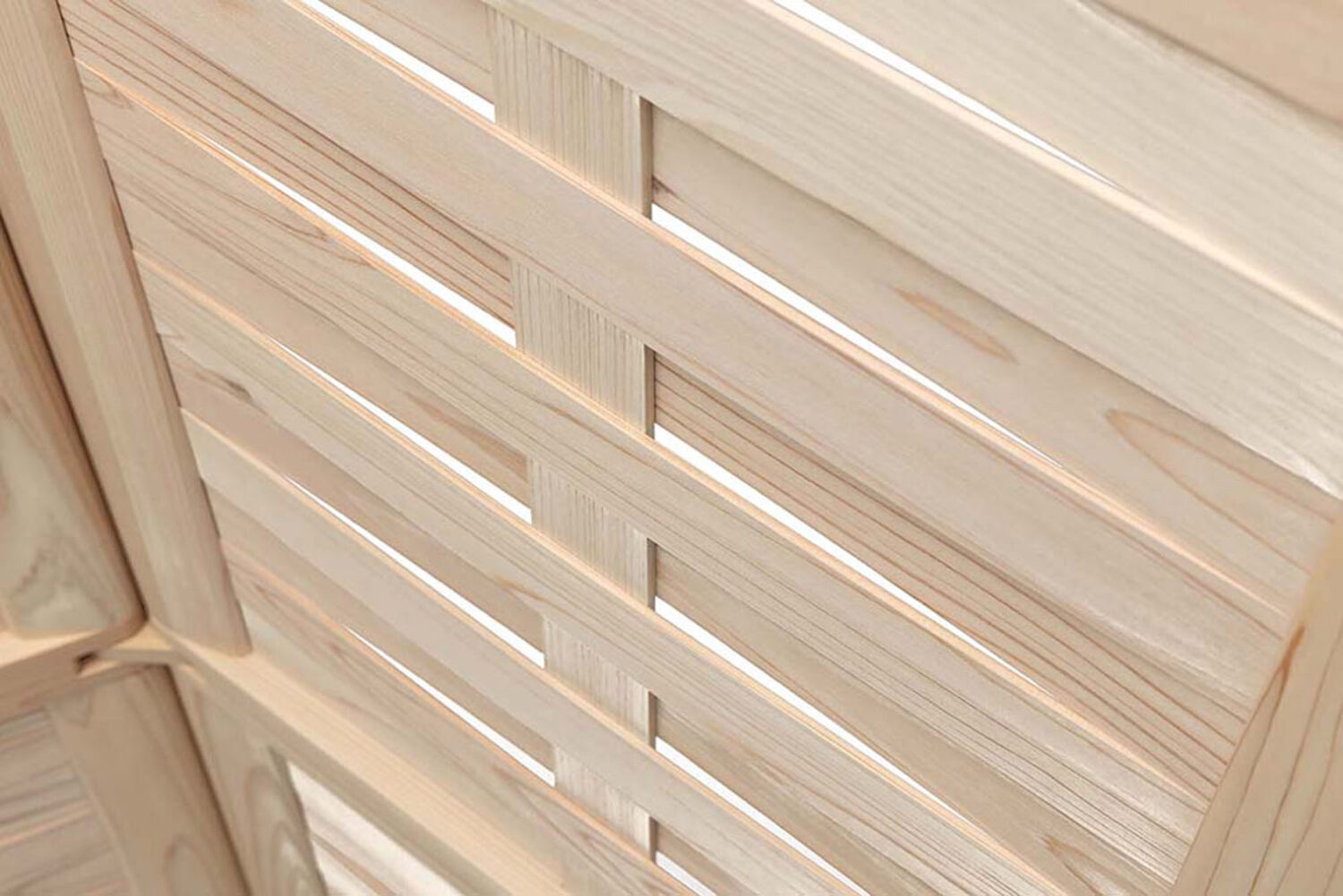 ヴィッレ・コッコネンによってデザインされた、折り畳み式の間仕切りです。研究者の側面をもつ彼らしい徹底したリサーチに基づくサスティナブルなアプローチによって、ヒノキの素材感を引き立てるモダンなパーティションが生まれました。パネル面には、工芸品などに見られる網代編み(あしろあみ)の技術が用いられ、美しい陰影を纏った豊かな表情を創り出しています。フレームはオリジナルの木製ヒンジで連結され、角度や開き具合を自由に調整することが可能。利用しない時はコンパクトに折り畳み、収納することもできます。サイズバリエーションは2種類。設置する場所や用途に応じ、多彩なアレンジをお楽しみいただけます。