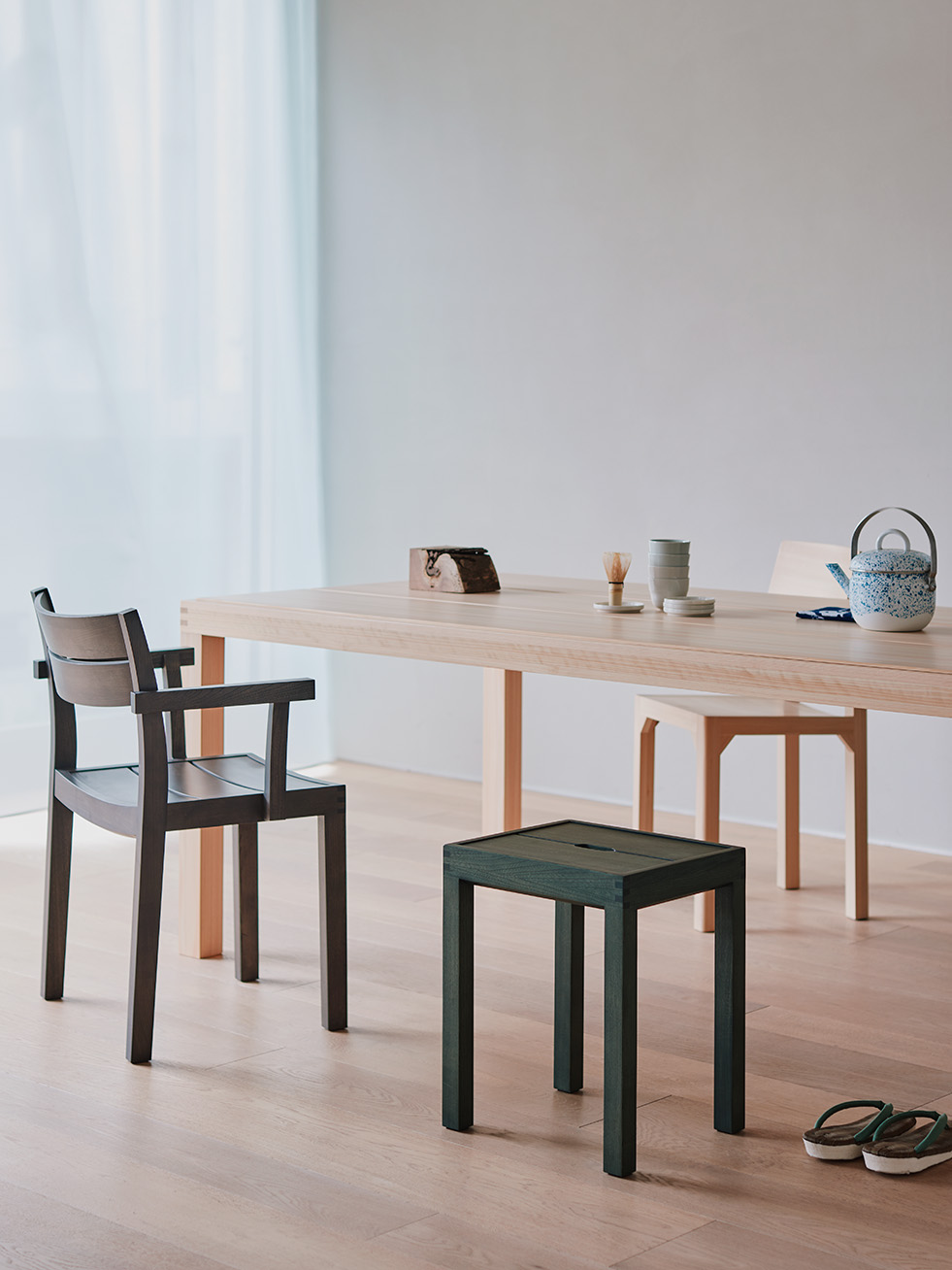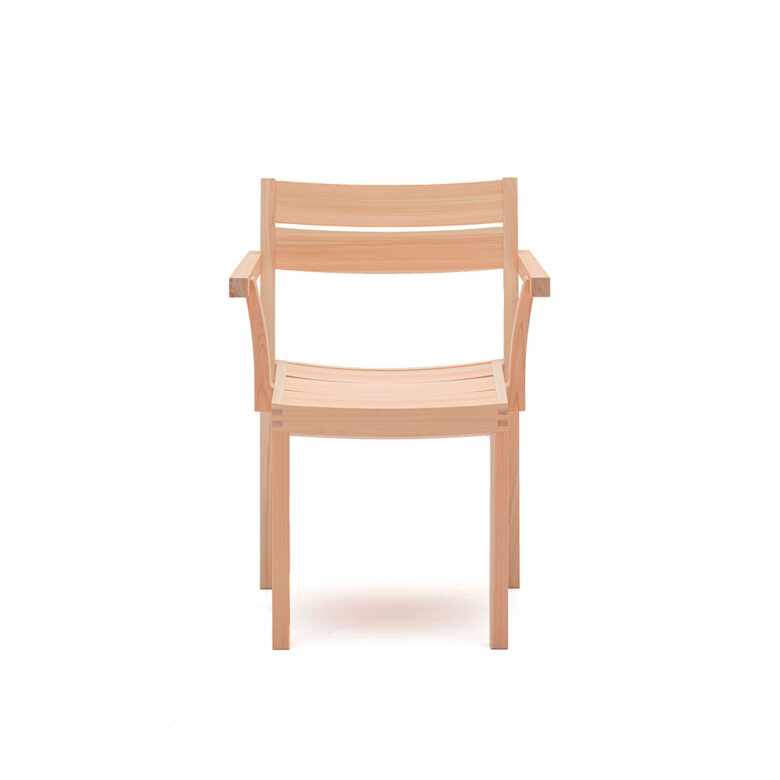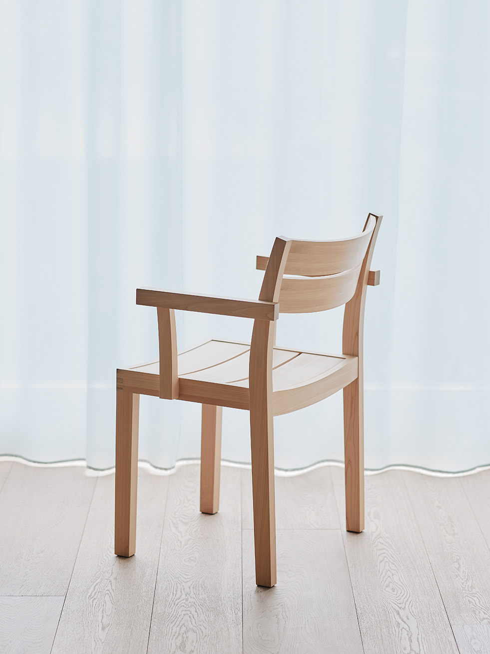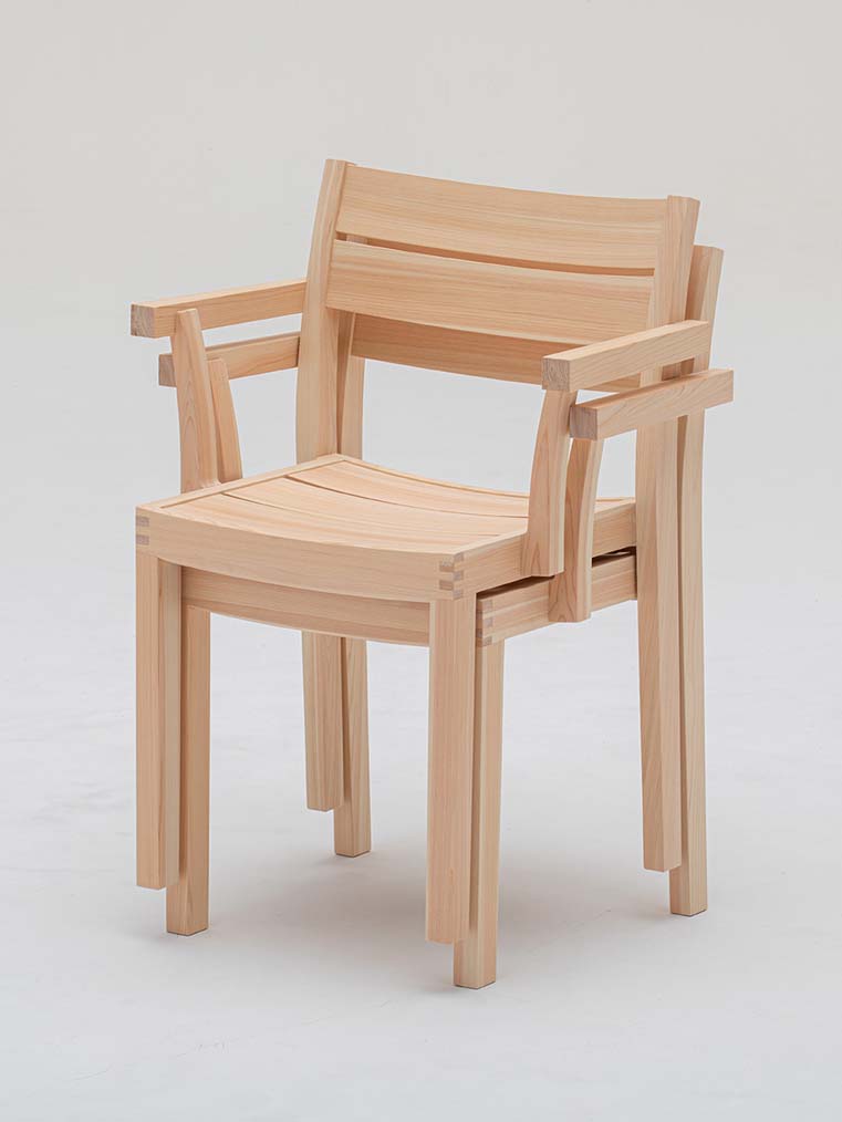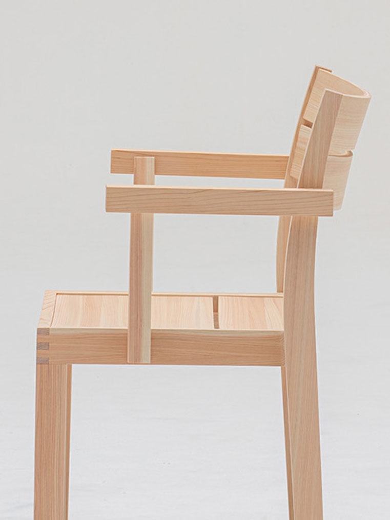 椅子のタイポロジーはそのままに、木目の美しさをフォルムに溶け込ませたWK Armchair 01。贅沢な木の質感を目や体で堪能できる1脚です。木材の接合部には枡にみられる「霰組(あられぐみ)」など、日本の伝統的な木工技術が用いられ、この椅子にアイコニックな表情を与えています。人間工学に基づき設計された緩やかな曲線を描く座面は、着座時の体の可動域や座り心地を考慮し設計され、長時間でも快適にご利用いただけます。椅子を構成する全ての部材が適切な機能を帯びた、MASを代表する1脚です。軽量で3脚まで積み重ねられます。